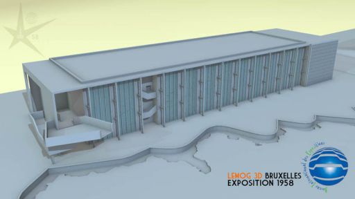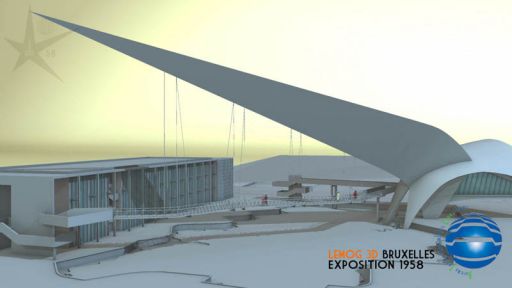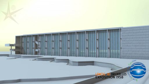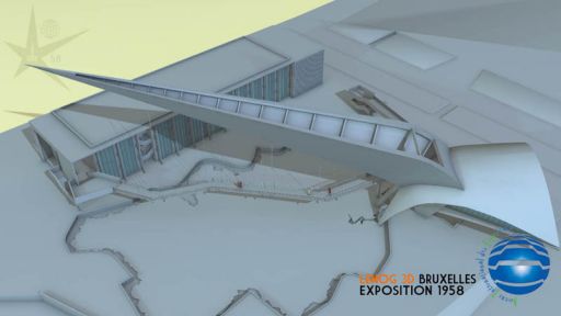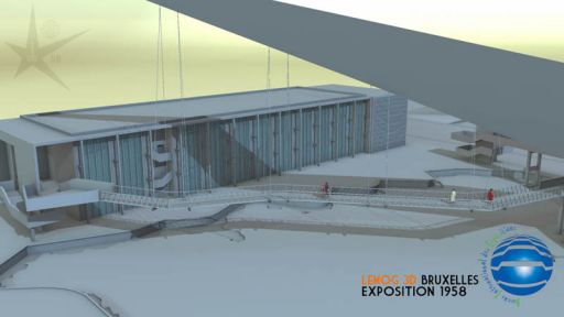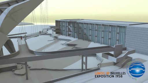 Maintenant, on comprend mieux le cheminement logique et ludique de ce circuit, qui commence à droite par cet escalier, qui se poursuit sur la passerelle soutenue par la Flèche, pendant qu'on observe sous ses pieds l'activité économique de la Belgique... pour finir par visiter ce bâtiment d'exposition...