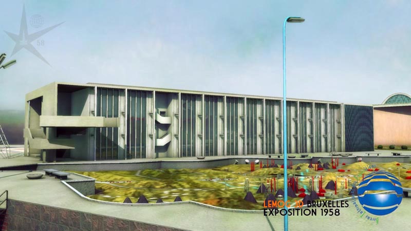 On passe au pavillon qui se trouve en face de celui du Génie Civil, celui de l'Urbanisme, celui-là également comporte des inscriptions, mais beaucoup plus petites qui seront certainement à peine visibles dans le film, je pense que je ferais donc l'essai de les mettre. Ce pavillon est suivi de la fameuse tour Eternit, et derrière, une forme basique servant à figurer un pavillon d'arrière plan.