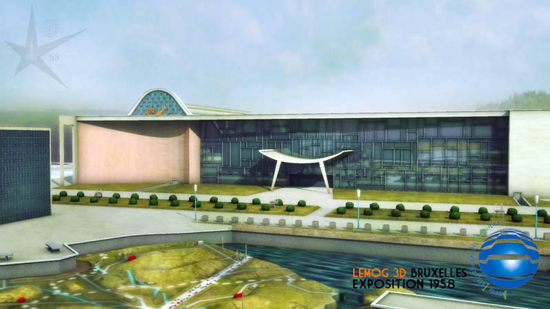 On aperçoit en arrière-plan la façade du grand palais de 1935, avec sa façade modernisée pour l'expo58.